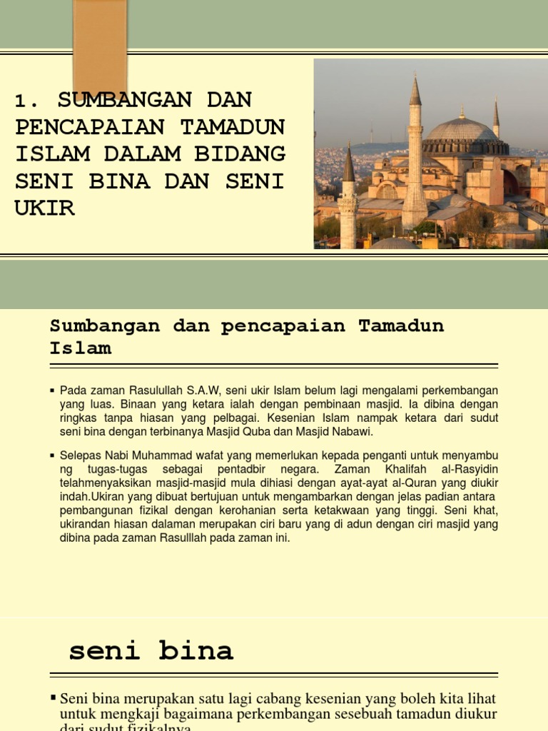 Sumbangan Dan Pencapaian Tamadun Islam Dalam Bidang Seni Bina Dan Seni Ukir By Ainur Husna from 0901.static.prezi.com Antara kota dan binaan yang masyhur adalah: Tamadun islam mempunyai keunikannya tersendiri dalam menonjolkan hasil seni binaannya , tidak hairanlah jika pernah suatu ketika tujuh binaan kubah merupakan satu tanda yang amat jelas dalam memperlihatkan seni bina islam kerana secara umumnya setiap masjid tentunya mempunyai kubah. Seni yang terhasil akan menjadi mercu kegemilangan sesuatu bangsa atau negara. Rujukan penting dalam memahami sejarah tamadun manusia. Seni bina islam adalah rangkaian gaya seni bina yang berkaitan dengan bangunan yang berkaitan dengan islam. Tamadun india tamadun agama sains bahasa kesusasteraan seni halus. Sains sosial & kemanusiaan, sains & teknologi, seni bina islam, pencapaian lain, mohammad azim ikhwan bin aziz a16a0368 universiti malaysia kelantan. Seni bina islam juga menonjolkan lambang keagungan sekaligus menonjolkan identiti islam.
