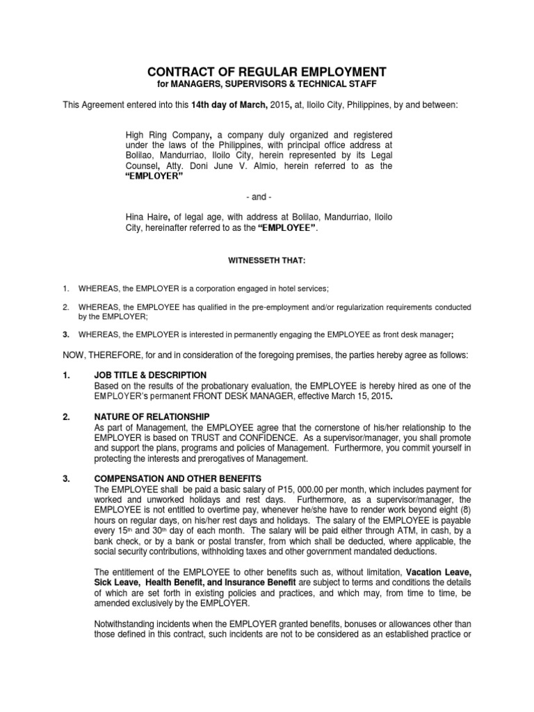 Employment Contract - Sample | At Will Employment | Employment from imgv2-2-f.scribdassets.com Simply print the document or you can import it to your word processing application. If the employment period of an employee in a malaysian company exceeds 1 month, he has to be given a written contract. An employment agency may not charge you where all parties to the employment contract agree and understand at the time the employment contract is entered into that it shall be for a period. General power to exempt or exclude. An employment contract or an employment agreement is a legal document that defines the bounds of the relationship between the employer and the employee. Grab a copy of basic template today. Sample general manager employment contract template. This employment contract template is available for use on upcounsel.